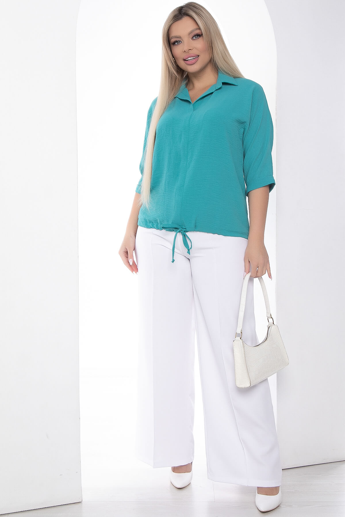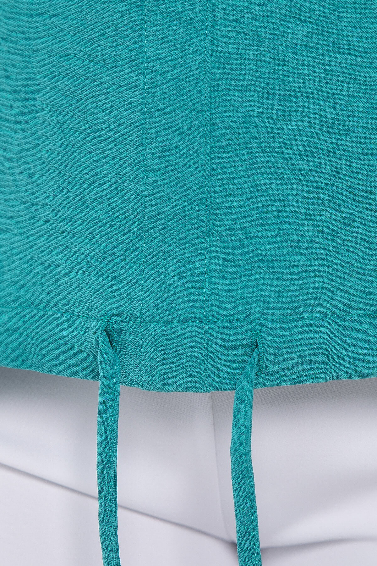Туника нежного бирозового цвета, которая прекрасно смотрится в повседневной жизни. Вороник рубашечного типа на стойке. По низу изделия шнурок из основной ткани. Подвеска в комлекте.