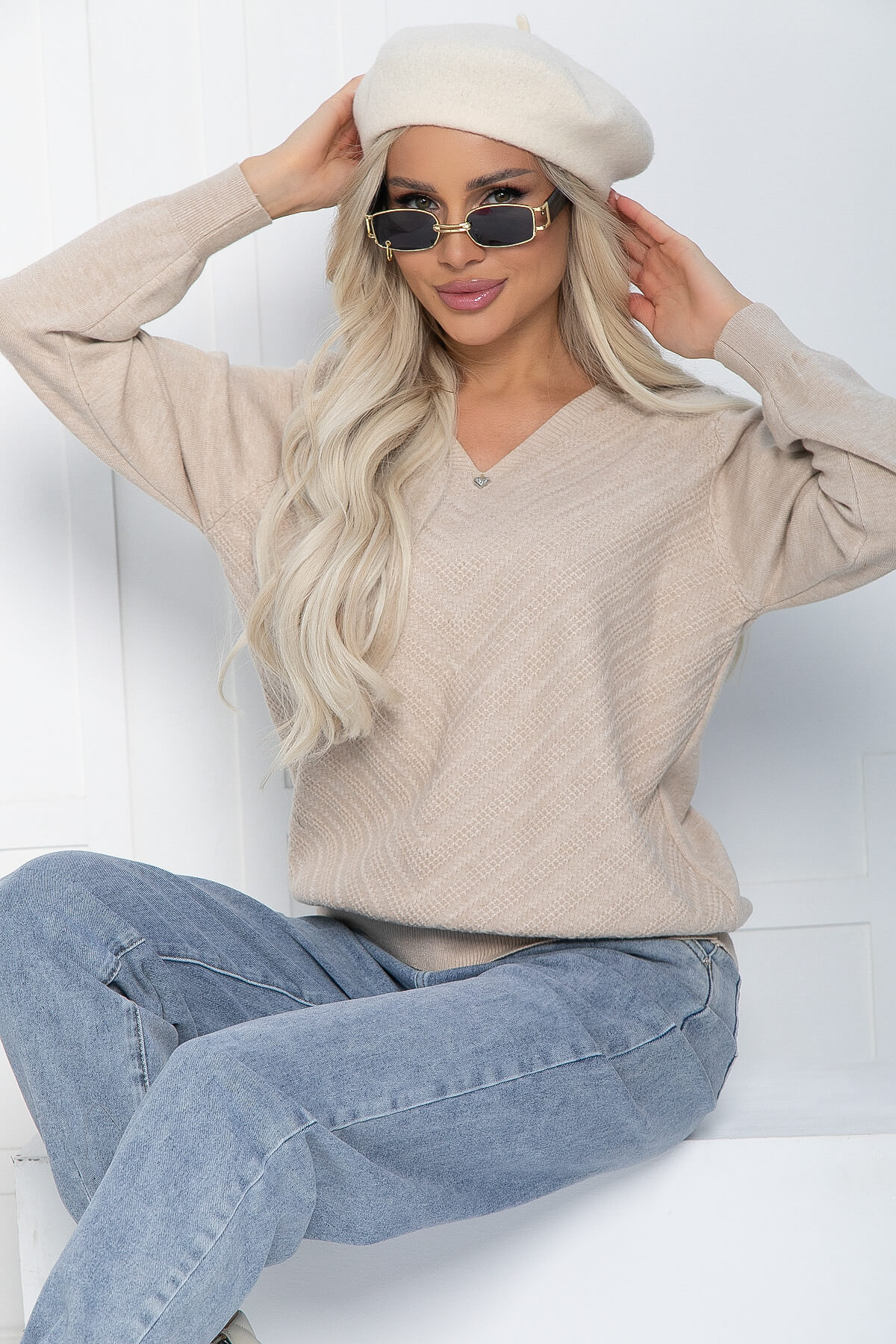 Уютный вязаный джемпер — прекрасный выбор для вашего повседневного гардероба. Он обладает элегантным V-образным вырезом, а на груди красуется очаровательное сердечко, украшенное стразами. Этот милый акцент придаёт джемперу особую изюминку, добавляя ему шарма.